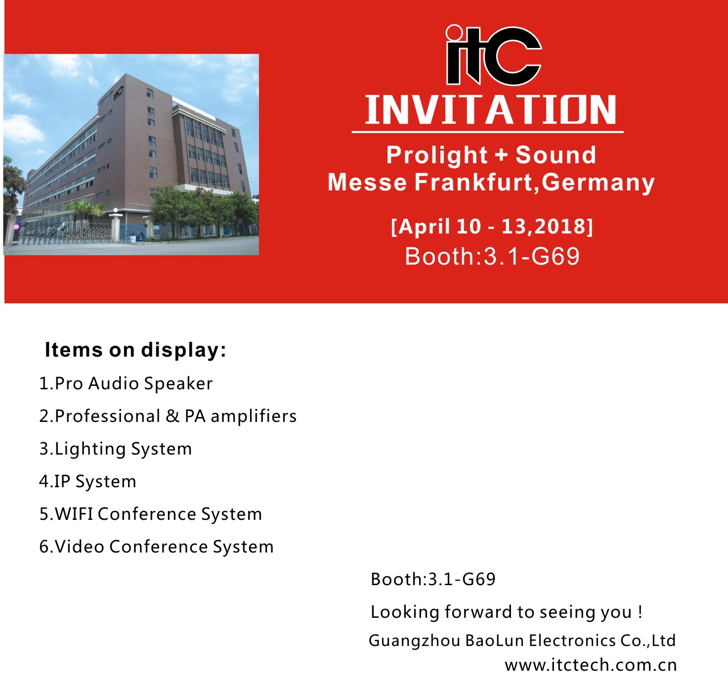 ITC(Guangzhou Baolun Electronics Co., Ltd.) treasure every opportunity to meet with you, our valued customer. From 2018.04.10-2018.04.13, we will be exhibiting at the "Prolight + Sound Fair". We cordially invite you to visit our booth 3.1-G69.
