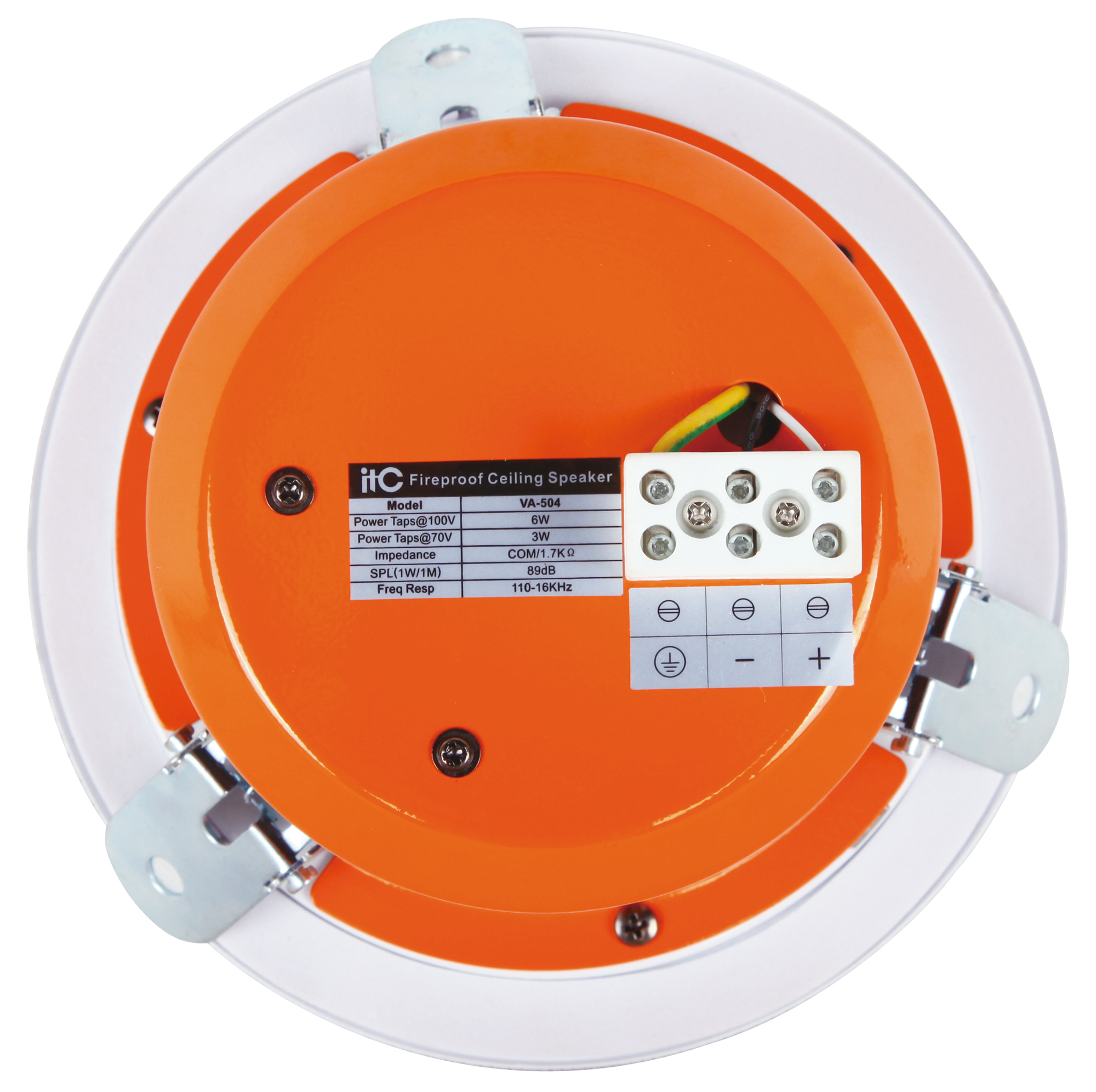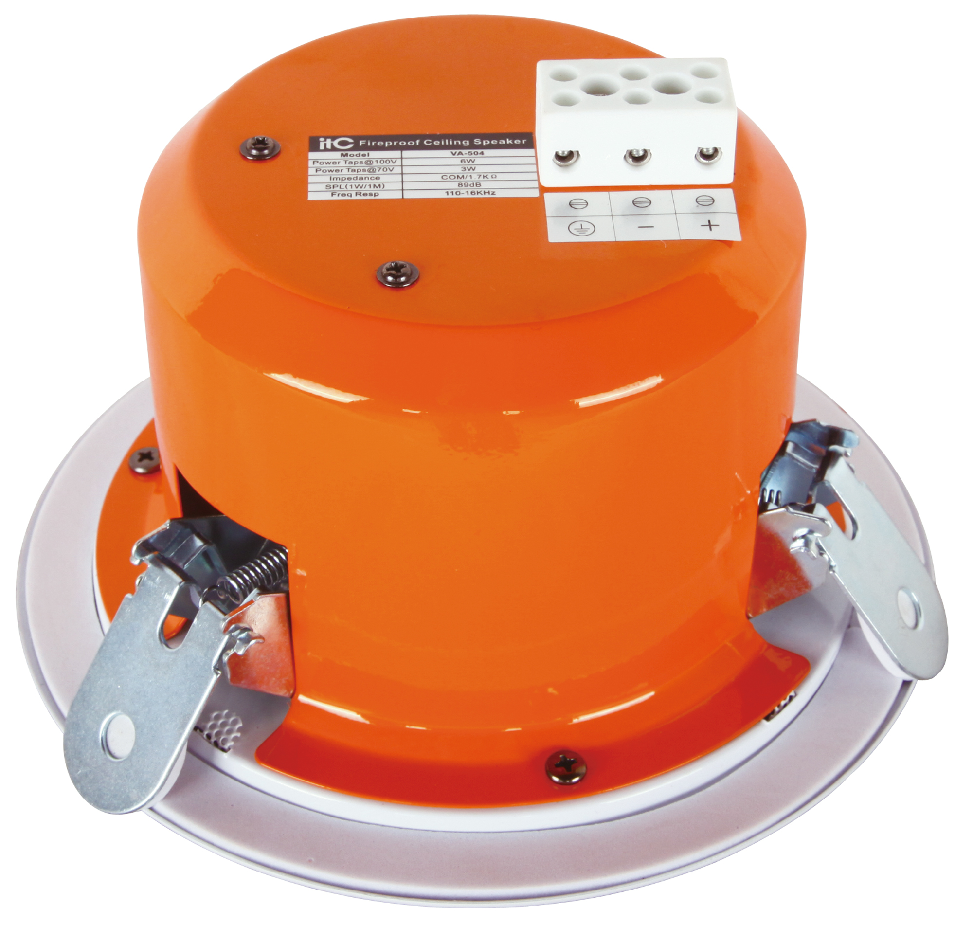 Indoor with flame retardant iron back cover full audio ceiling speaker, fireproof design, spring presser foot system, convenient for user installation. Application: fire fighting, shops, supermarkets, hotels, etc.