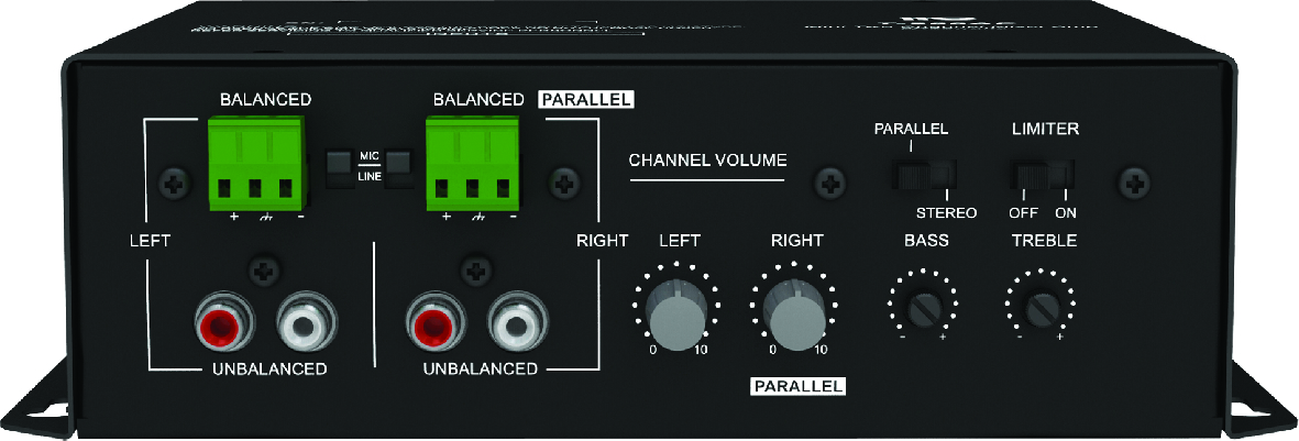 * 2 Mic/line switchable inputs by phoenix connectors and 2 unbalanced aux inputs by dual RCA type.