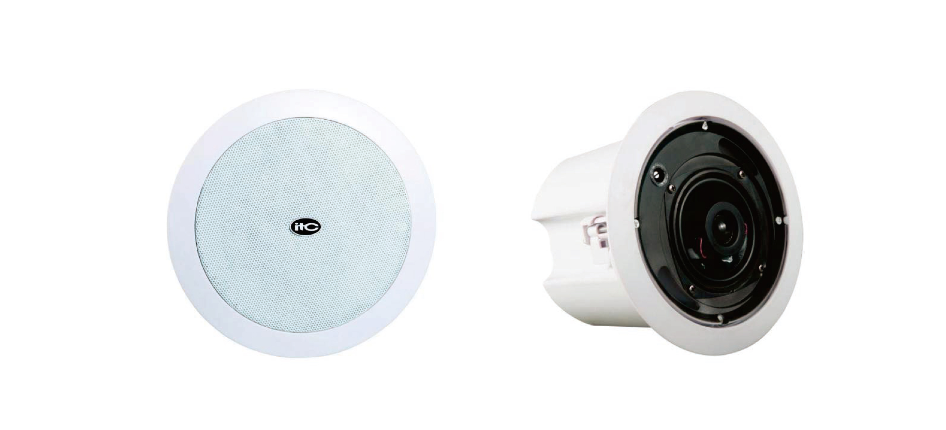 Indoor high-end ceiling speakers, plastic flame-retardant rear cover, screw-fixed presser foot system; vent holes enable perfect sound reproduction; suitable for hotels, clubs, etc.