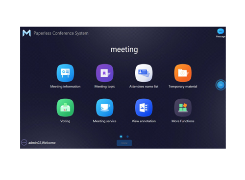 * Support centralized control operation, control the terminal to switch to display the welcome page, exit the welcome page, display slogans, exit slogans, display nameplates, exit nameplates, large screen on, large screen off, pause the meeting, continue the meeting, end the meeting, control the terminal power on and off, support the shutdown control of the server, support the unified lifting of paperless lifters and microphones.