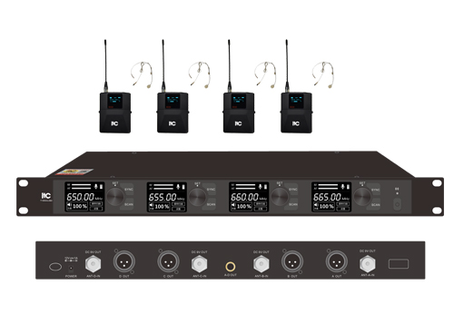 * It has 1 receiving host and 4 head -mounted waist packs; the frequency range is 540MHz-590MHz and 640MHz- 690MHz .